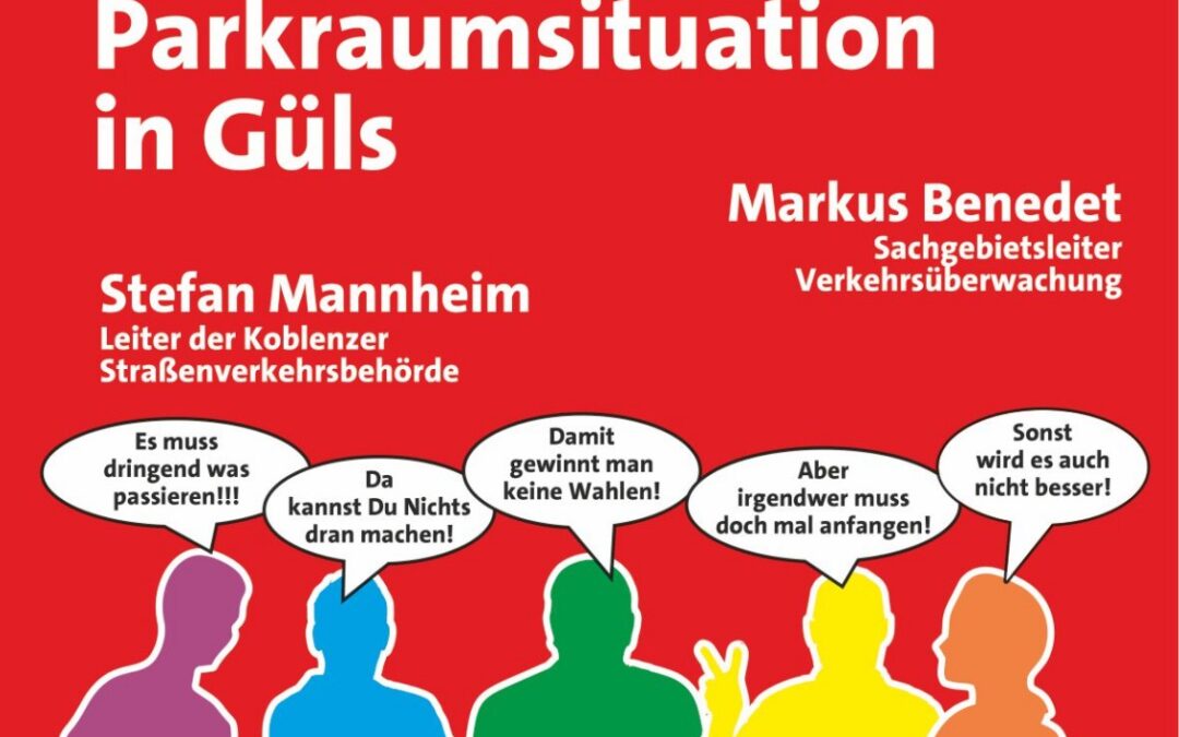 Die Gülser SPD setzt Ihre traditionelle Veranstaltungsreihe „SPD Güls hört zu“, am Mittwoch, 22.04. um 19:30 Uhr im Weingut Lunnebach fort. Dieses Mal geht’s in der ca. zweistündigen Veranstaltung primär um die vielfältigen Herausforderungen im Zusammenhang mit der Verkehrs- und Parkraumsituation in vielen offenen und versteckten Ecken von Güls und Bisholder.