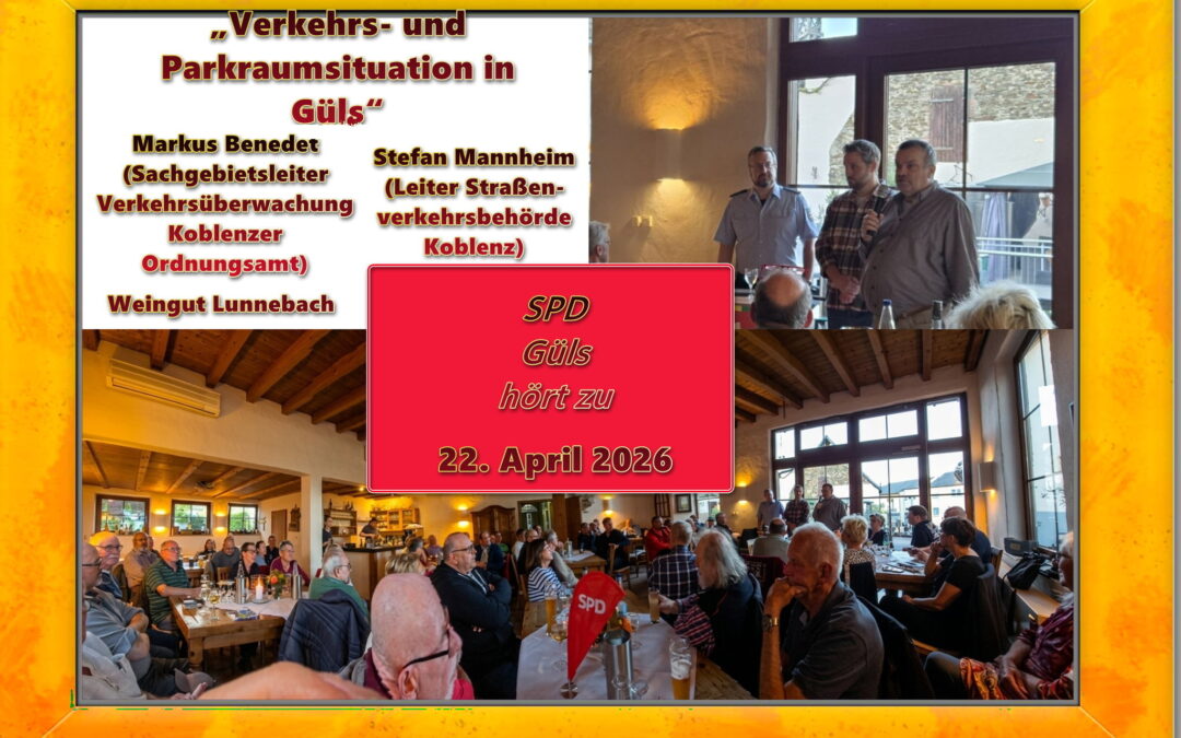 Am 22.04. fand wieder die Veranstaltung „SPD Güls hört zu“ statt, ein Dialogformat, das regelmäßig dazu dient, der lokalen Politik eine direkte Rückmeldung über die drängendsten Probleme vor Ort zu geben. Das Thema der Diskussion diesmal war „Verkehrs- und Parkraumsituation in Güls“.